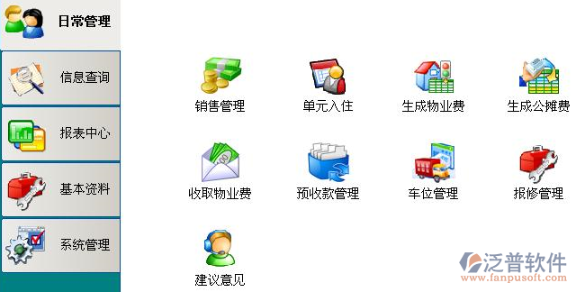日常管理(如銷(xiāo)售管理、單元入住、生成物業(yè)費(fèi)、生成公攤費(fèi)、收取物業(yè)費(fèi)、預(yù)收款管理、車(chē)位管理、報(bào)修管理及住戶(hù)的建議意見(jiàn)等);