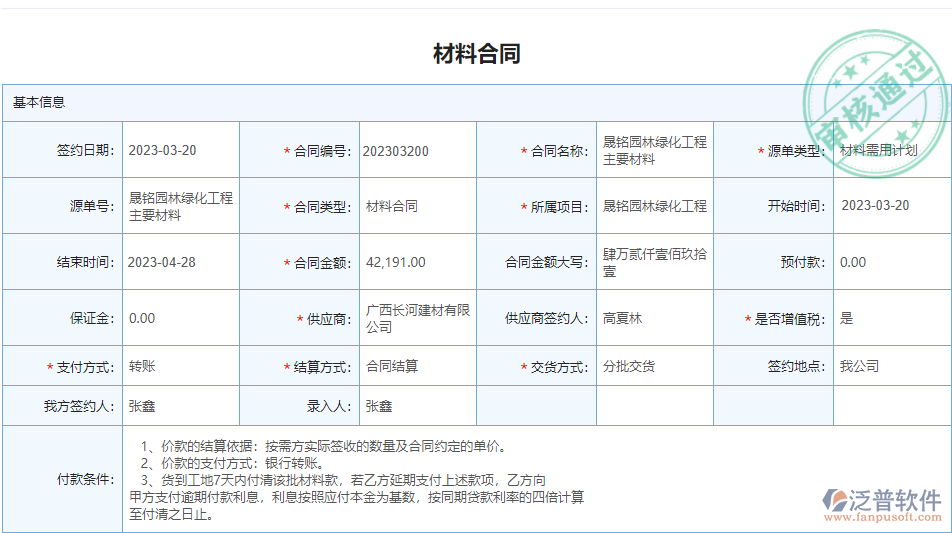 3、系統(tǒng)中的材料合同就是針對園林工程企業(yè)和供應商采購材料這塊的管控,將每次和供應商簽訂合同的重要條款以及苗木價格、合同相關附件上傳,后期也能快速查詢合同情況,同時領導也能對于和供應商簽訂的合同條款進行審核了解,避免后期出現(xiàn)因為合同審核不到位導致施工現(xiàn)場人員停工待料的情況出現(xiàn)。