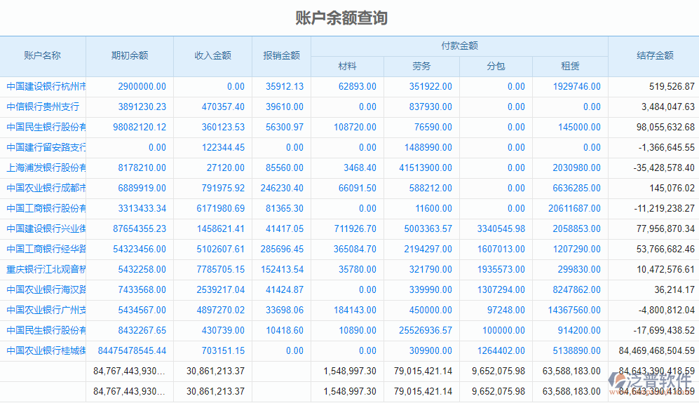 3、系統(tǒng)中的【賬戶余額】統(tǒng)計(jì)企業(yè)內(nèi)部銀行賬戶的期初和收支情況,自動(dòng)匯總每個(gè)銀行賬戶總收支費(fèi)用,幫助企業(yè)領(lǐng)導(dǎo)實(shí)時(shí)了解銀行賬戶情況