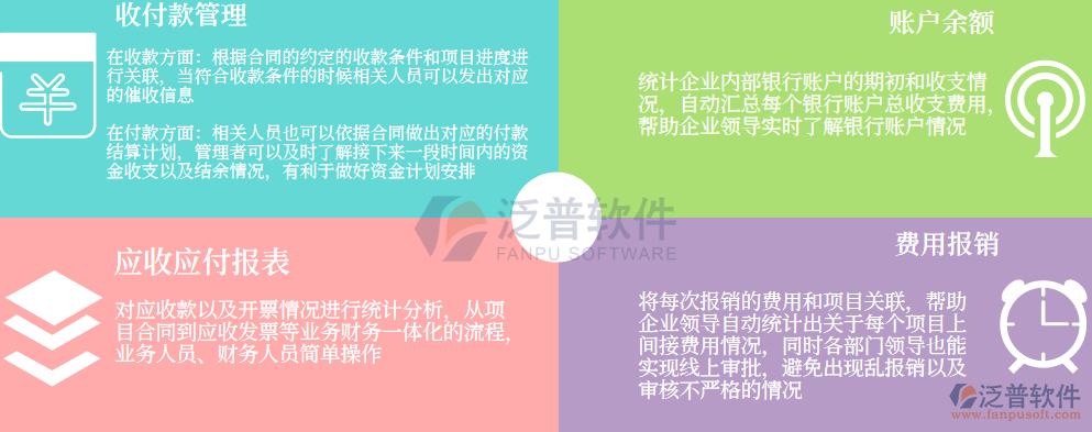 通過以上的這些問題可以看出企業(yè)中傳統(tǒng)的“人管人”、“Excel表格”等方式在財(cái)務(wù)中的管理效率不僅低,而且還容易出現(xiàn)管理漏洞的情況。因此泛普軟件針對以上在財(cái)務(wù)管理上的問題,利用信息化的管理方式來規(guī)范企業(yè)收付款的管理,提高企業(yè)在資金費(fèi)用上的管理。
